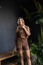 A blusa em tecido rami fluido traz recortes estratégicos com aplicação do tecido guipure bordado exclusivo, no busto e nas mangas, criando um efeito visual sofisticado — ideal para quem ama detalhes com personalidade.