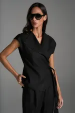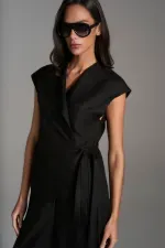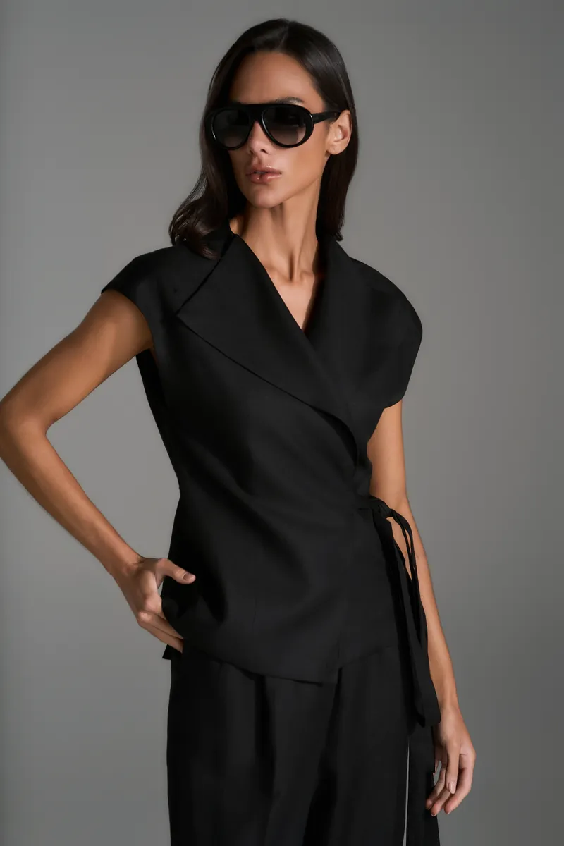 Conjunto em mix de viscose e linho com blusa de gola longa estilo casaco, transpassada com fechamento por amarração e ombros alongados. A calça tem shape reto e sequinho com fechamento por zíper e colchete, pregas, bolso faca e lapelas aplicadas nas costas.