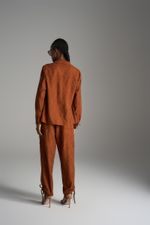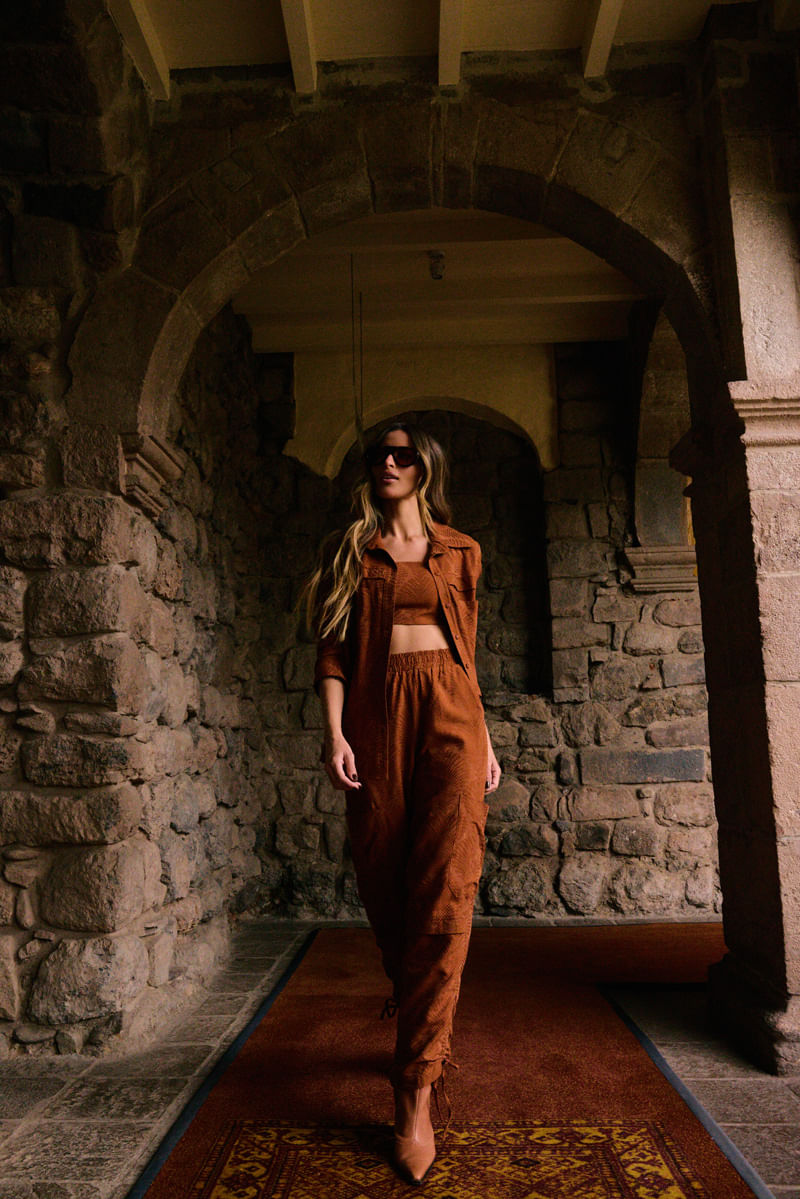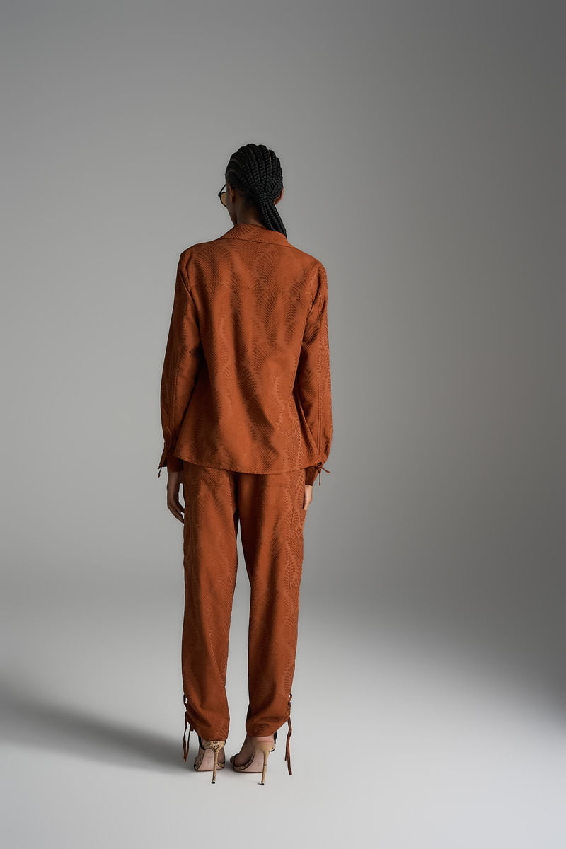 Conjunto em tecido texturizado com manga de comprimento alongado, mangas com regulagem que possibilita deixar curta e franzida ou longa e lisa, possui também bolsos de 2 lados e peças horizontal acima dos bolsos. O conjunto tem calças reta com cós de elástico, Bolsos nas laterais e regulagem nas pernas para deixá-las mais curtas com leve franzido.