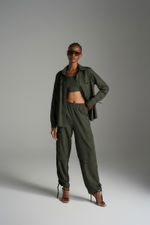 Conjunto em tecido texturizado com manga de comprimento alongado, mangas com regulagem que possibilita deixar curta e franzida ou longa e lisa, possui também bolsos de 2 lados e peças horizontal acima dos bolsos. O conjunto tem calças reta com cós de elástico, Bolsos nas laterais e regulagem nas pernas para deixá-las mais curtas com leve franzido.