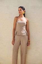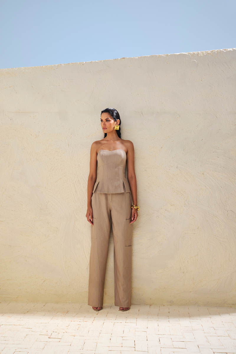 Conjunto de alfaiataria com design contemporâneo e recortes estratégicos que trazem frescor e estilo ao visual. O top tomara que caia possui busto estruturado com recortes que criam fendas sutis na barra frontal, valorizando a silhueta com originalidade. Conta com lastex nas costas para melhor ajuste ao corpo e zíper central que facilita o vestir.