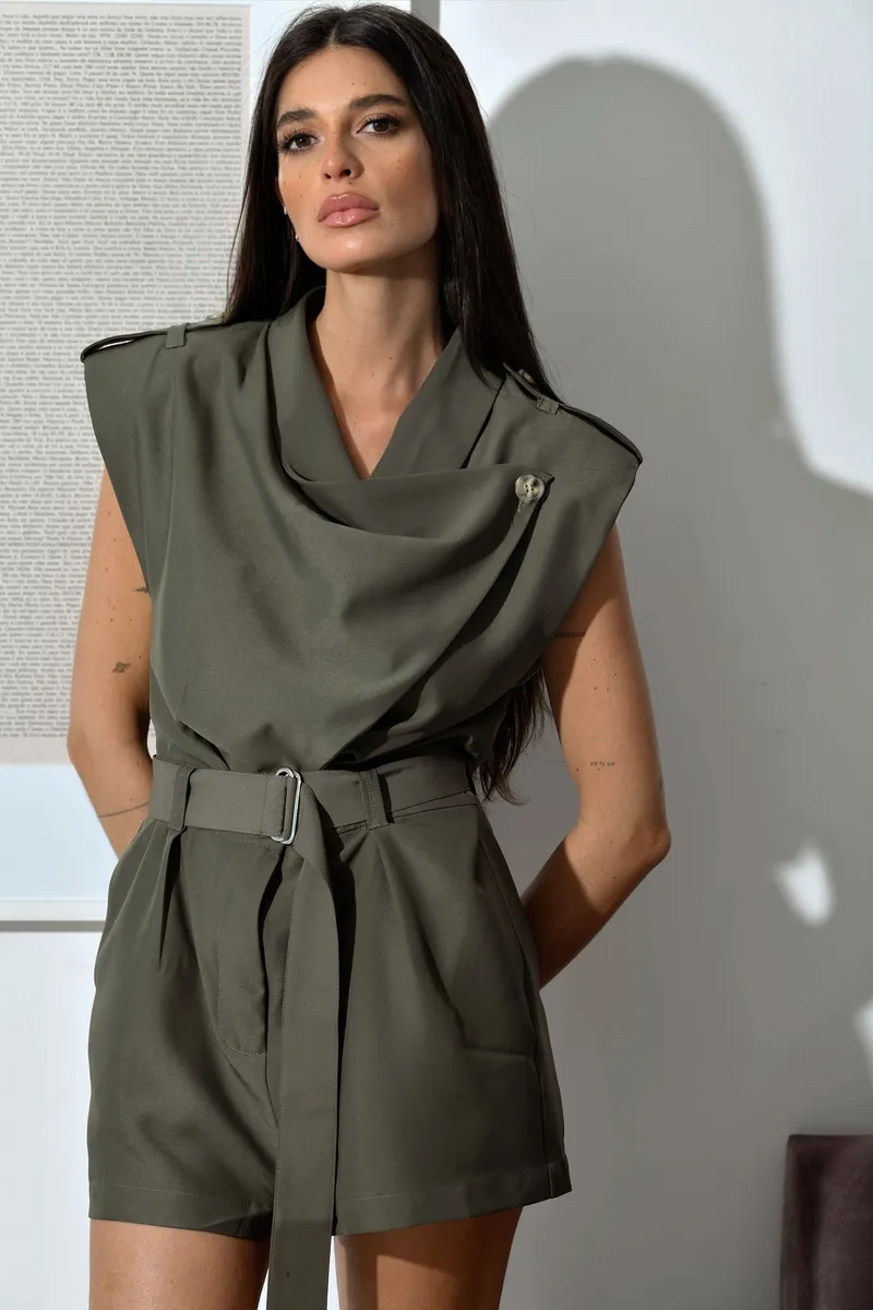 Decote drapeado, ombros marcados, cinto do mesmo tecido e bolsos laterais que reforçam a proposta utilitária.