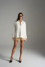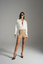 Short em alfaiataria estruturada com fechamento de zíper e botões de pressão metalizado, bolsos com recorte assimétrico na frente e barra larga. Nas costas recorte de pala e bolsos com boca em forma curva aplicado com pespontos. Detalhes de rebites metalizados finalizam os bolsos.